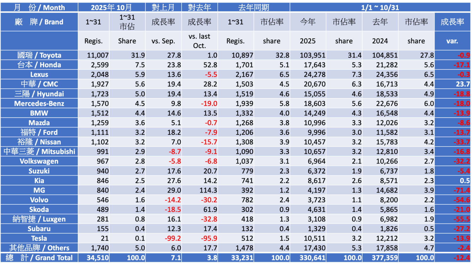 ●十月份新車掛牌數字出爐,總市場為34,511台,較九月份成長了7.1%,也較去年十月份成長了3.9%。